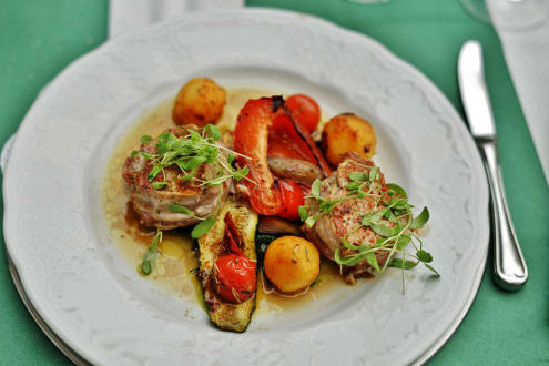Der Hauptgang: Kalbsfilet im Speckmantel mit italienisch zubereitetem Gemüse