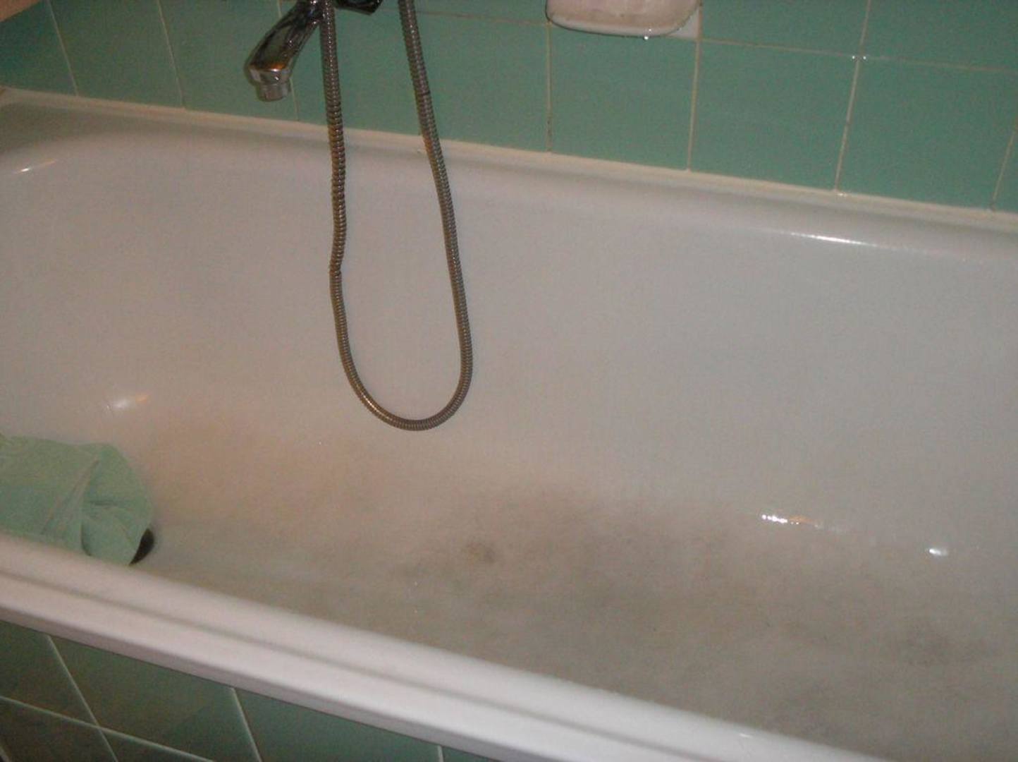 Unsere Badewanne, wenn man genau hinsieht, sieht man das schwarze am Badewannenboden (wir konnten das leider nicht weiter identifizieren, war aber super eklig)