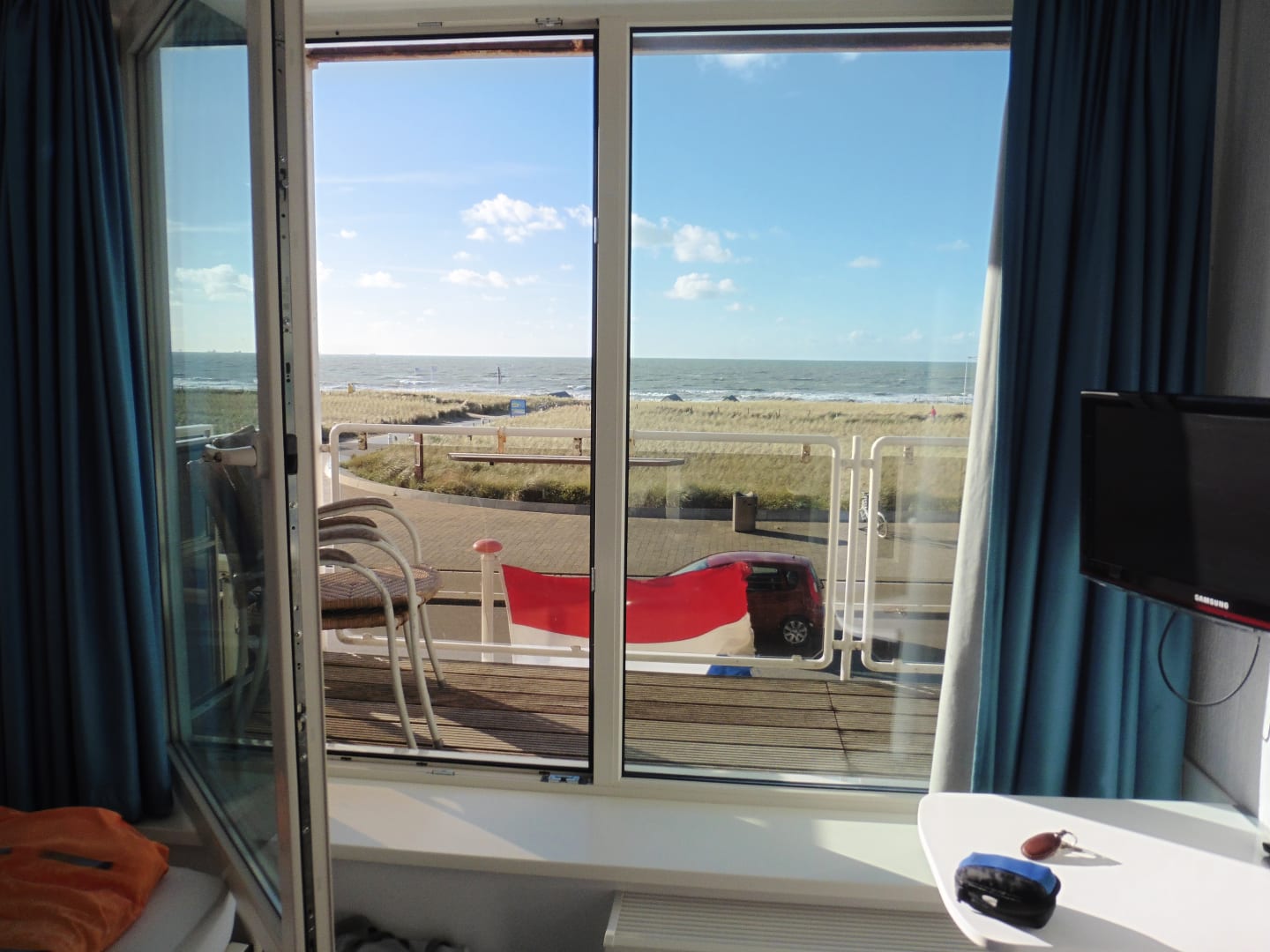 Blick zum Balkon und zum Strand.