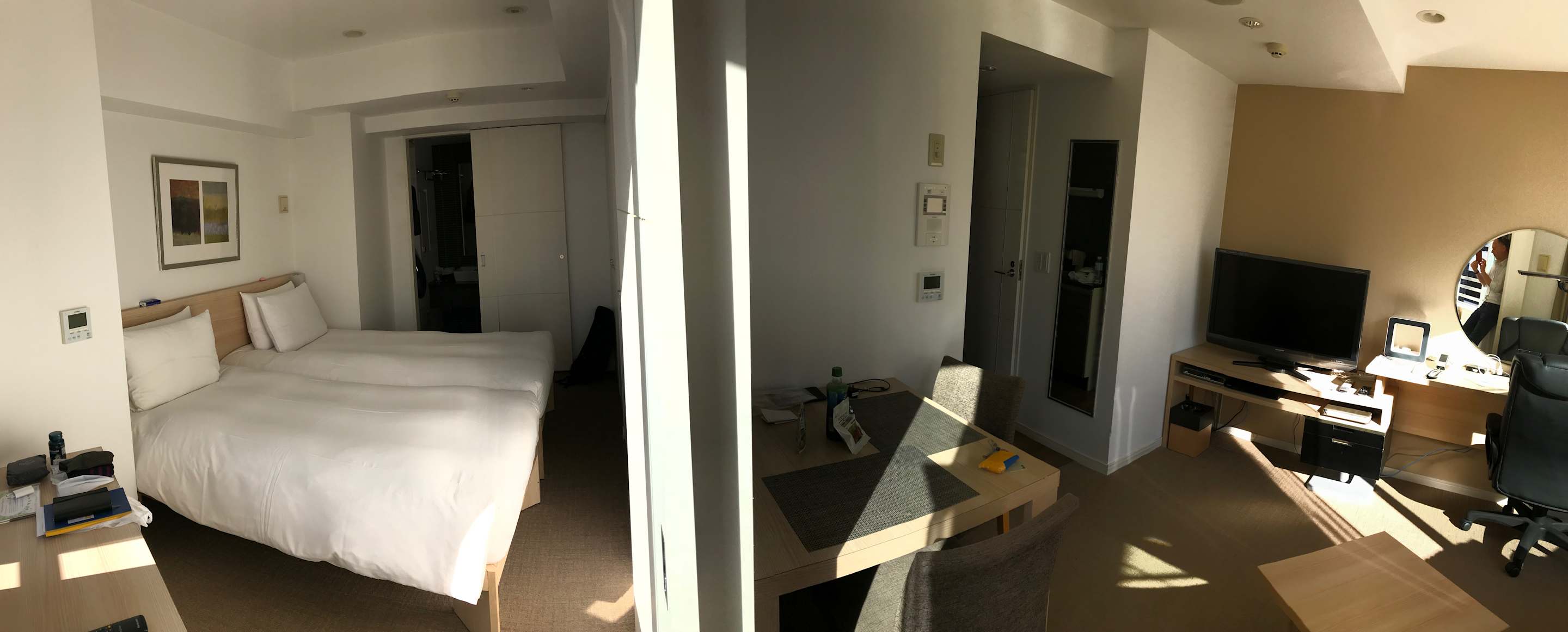 Zimmer 403, das Fenster im Rücken, Blick in Schlafzimmer und Wohnbereich