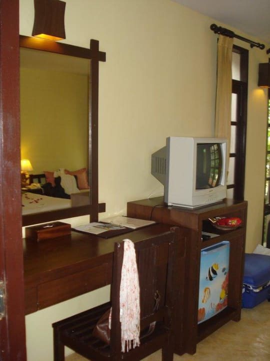Schreibtisch, Spiegel, Kühlschrank und TV (Deutsche Welle empfangbar)