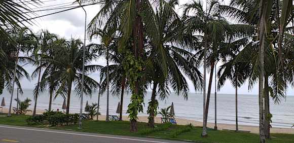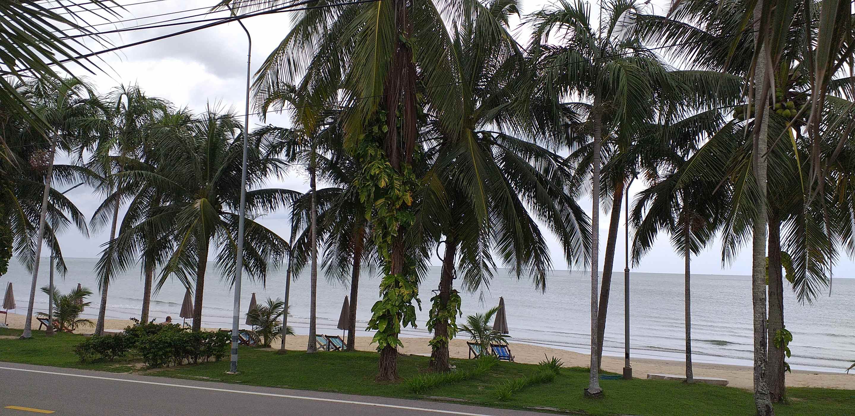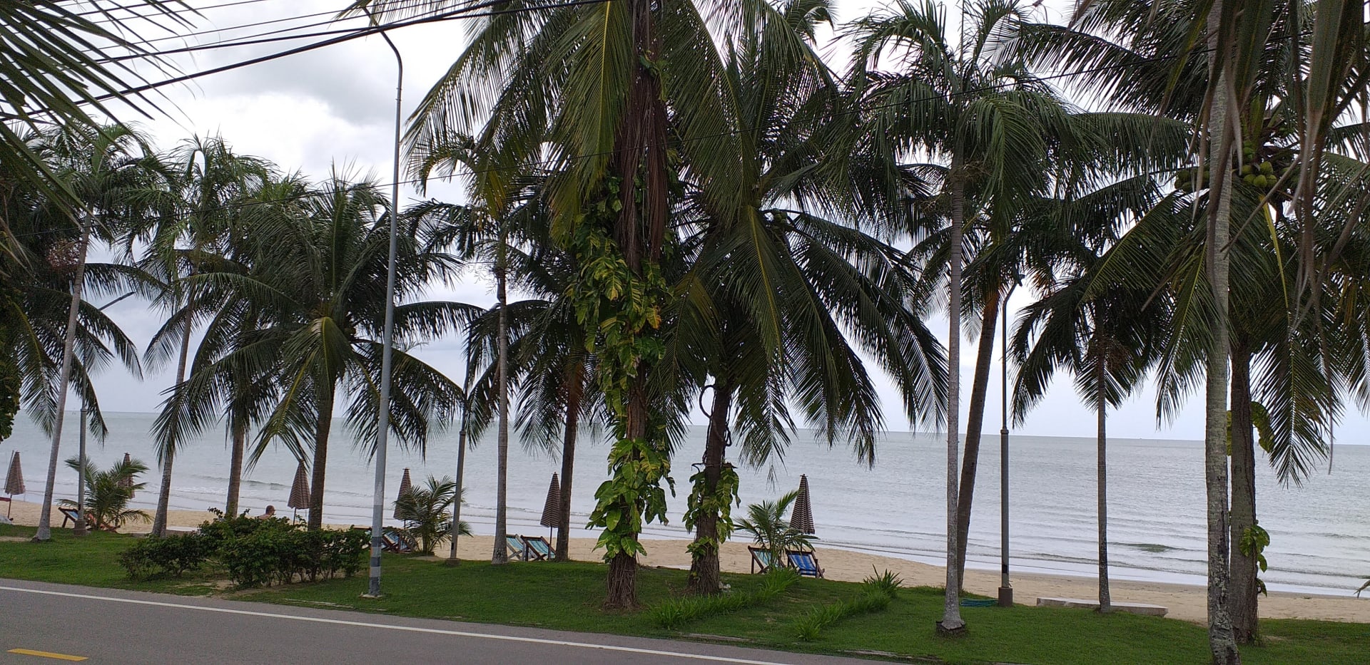 Strand mit freien Liegestühlen und Sonnenschirmen. Strandstraße nur schwach befahren.