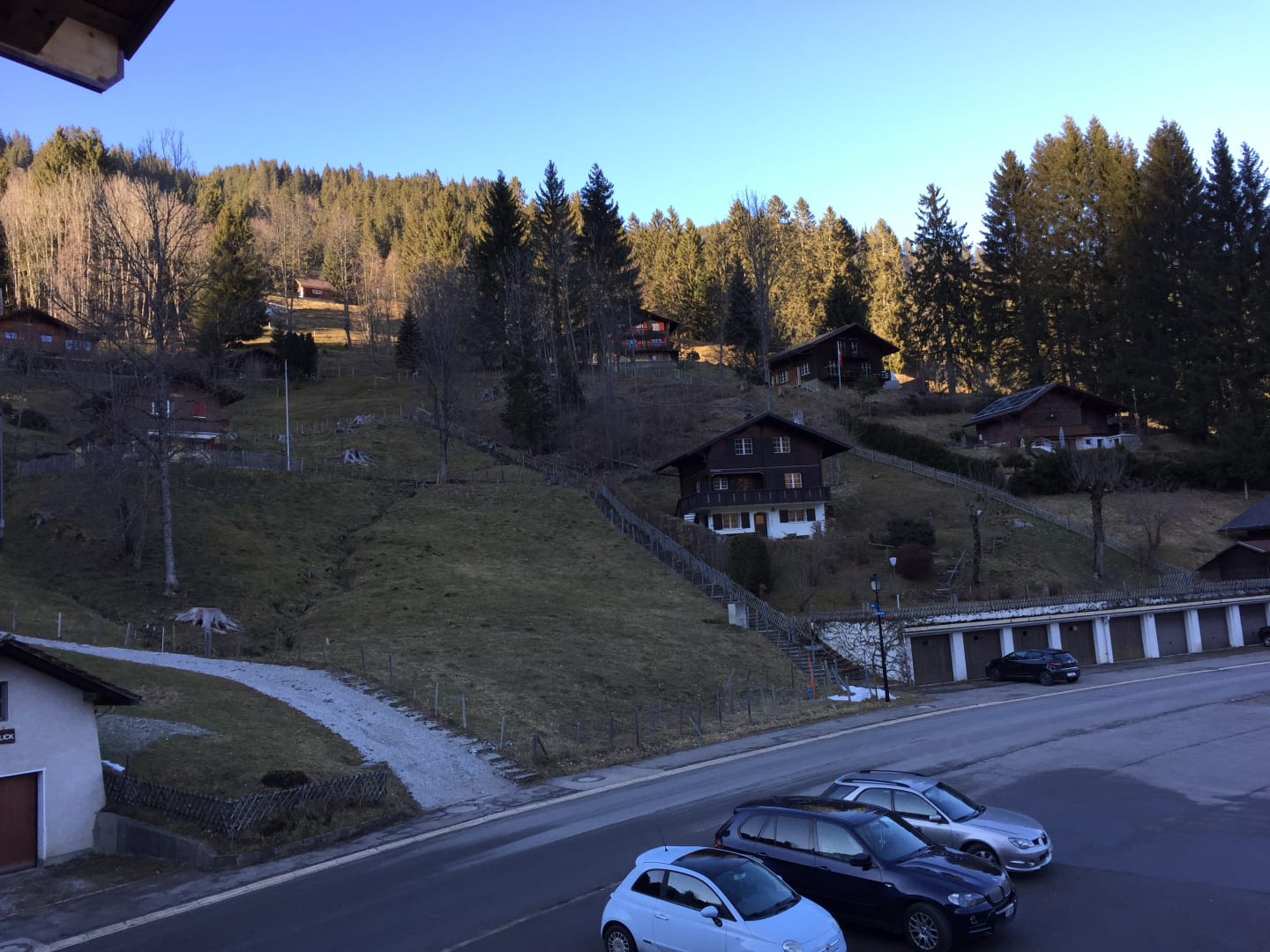 Blick vom Zimmer auf den Parkplatz und die Strasse