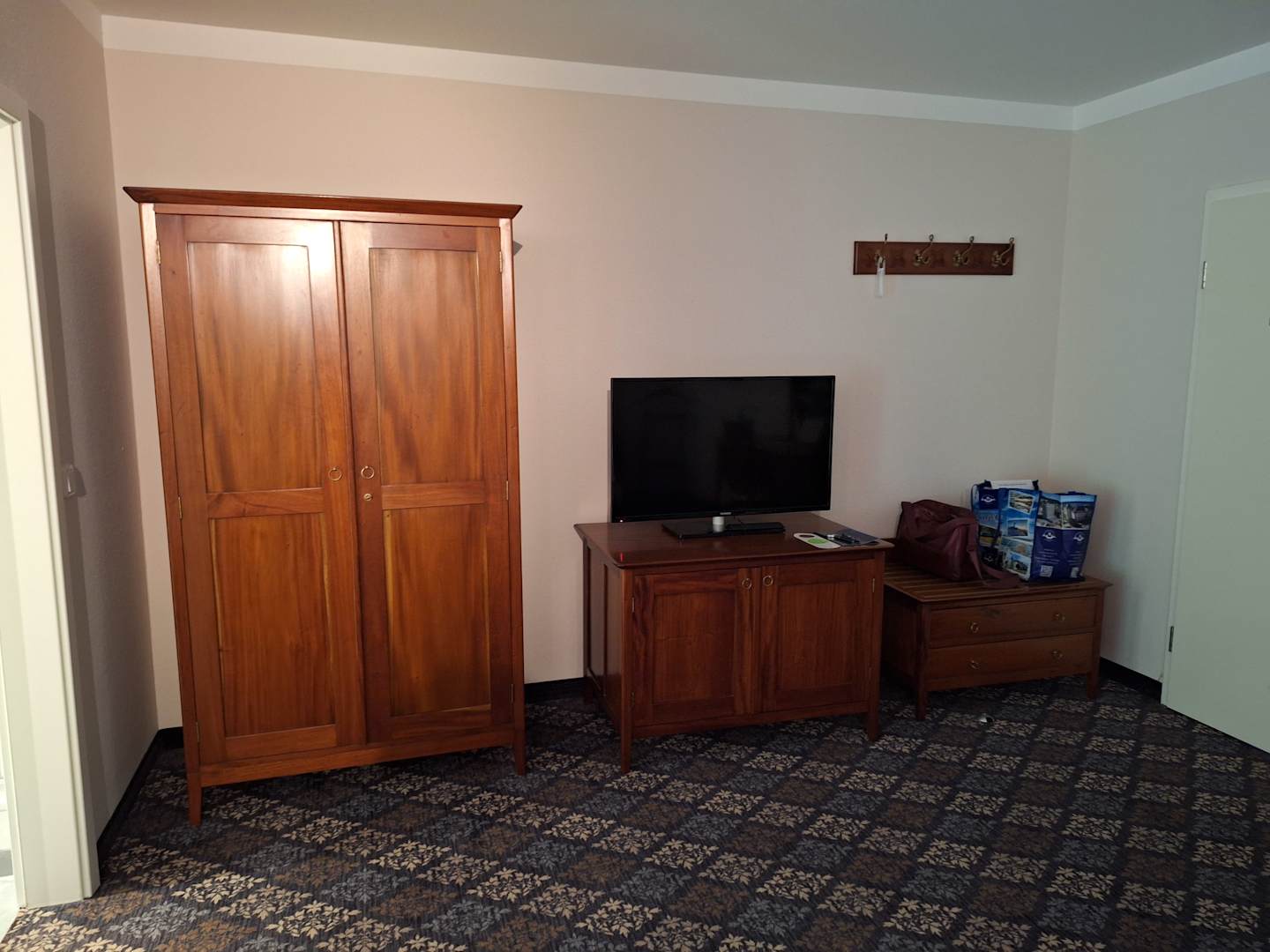 Großes Zimmer mit Schreibtisch und großen TV und Schrank