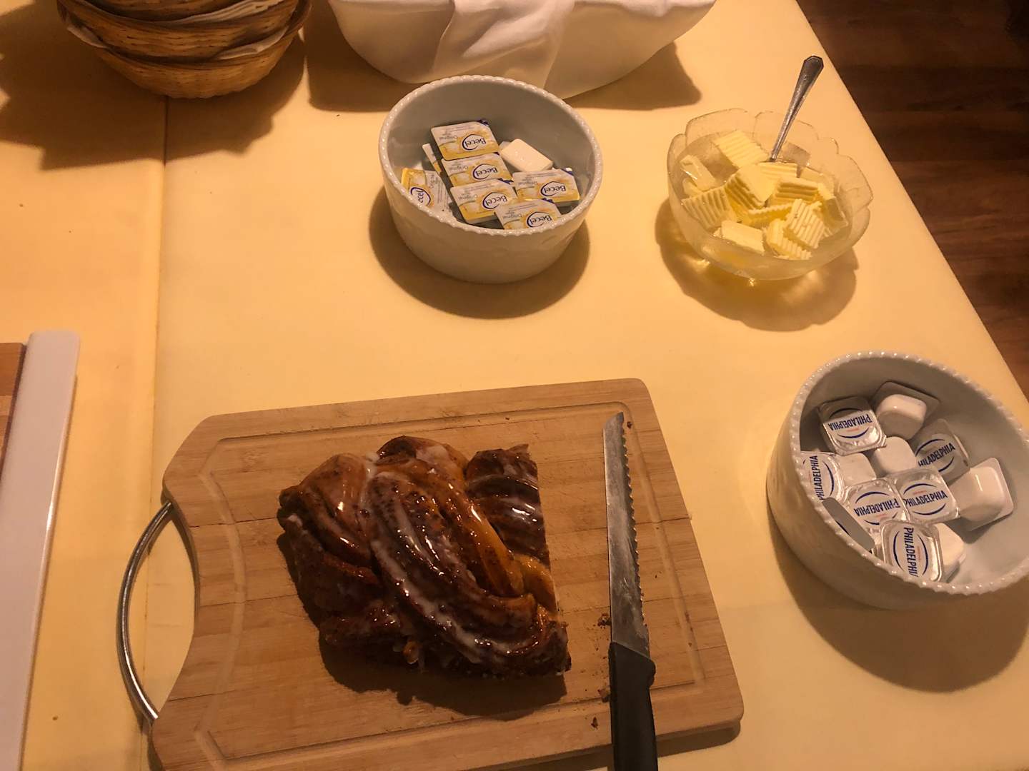 Süßer Hefezopf, es gibt Margarine, Butter und Philadelphia zum Frühstück