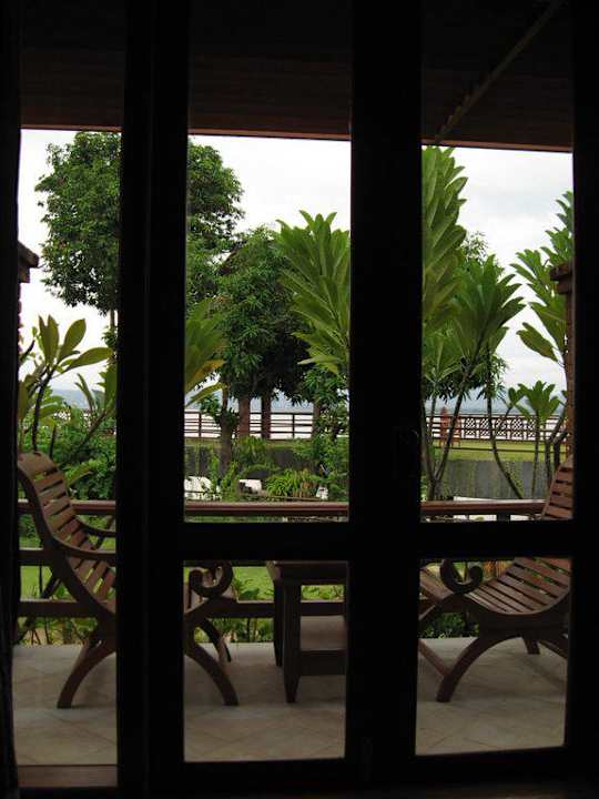 Blick von innen auf Balkon und Landschaft