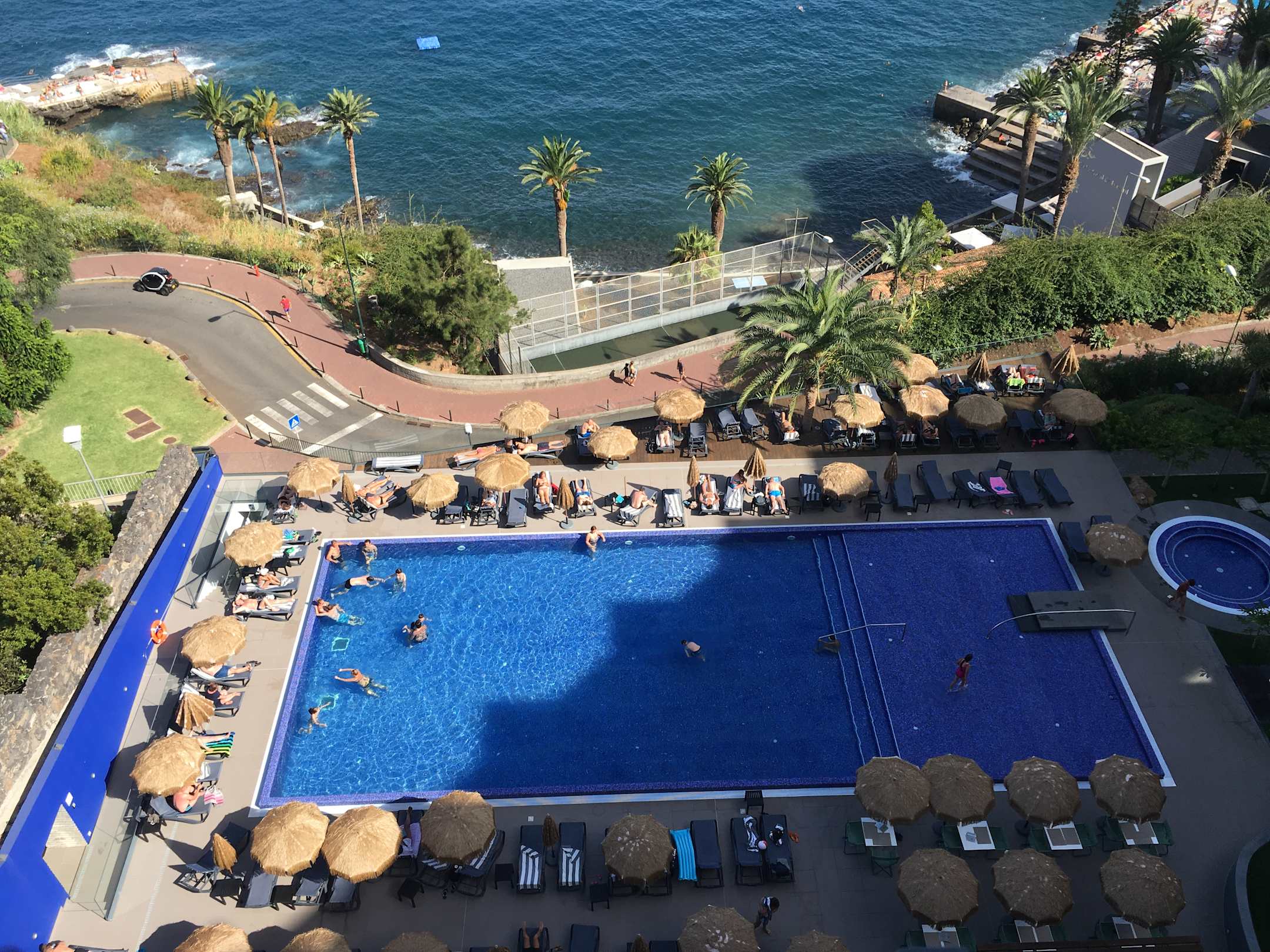 Blick vom Balkon (9. Etage) auf Pool und Meer