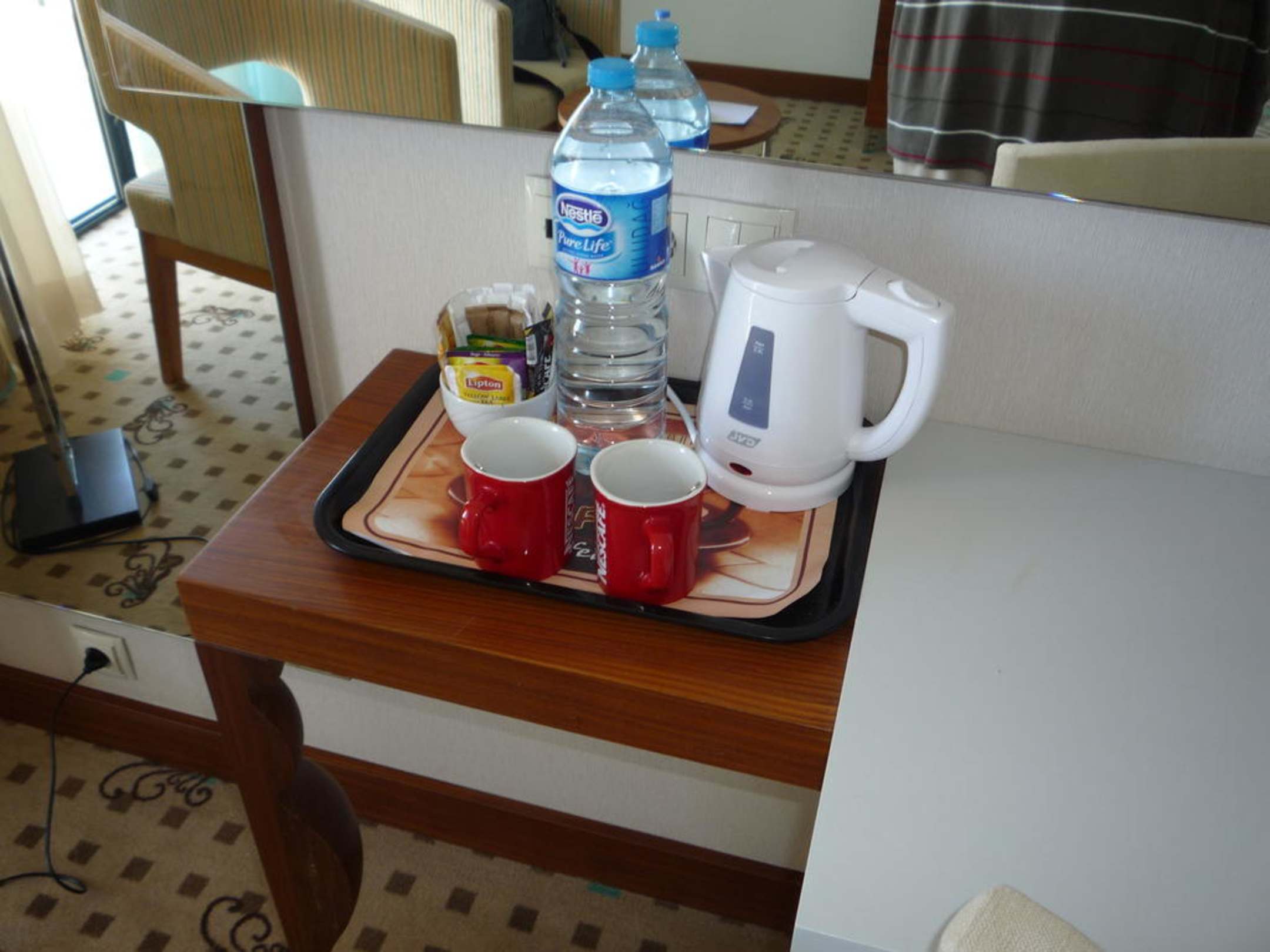 Auf jedem Zimmer gibt es einen Wasserkocher, Tee, Kaffeepulver, Zucker etc.