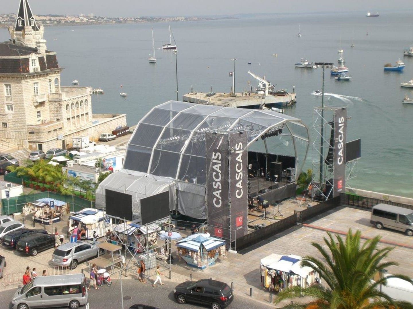 Blick auf das Meer von der Dachterrasse mit dem gerade beendeten Bühnenaufbau für die Festag do Mar. Den ganzen Nachmittag fanden laute Bühnenproben statt