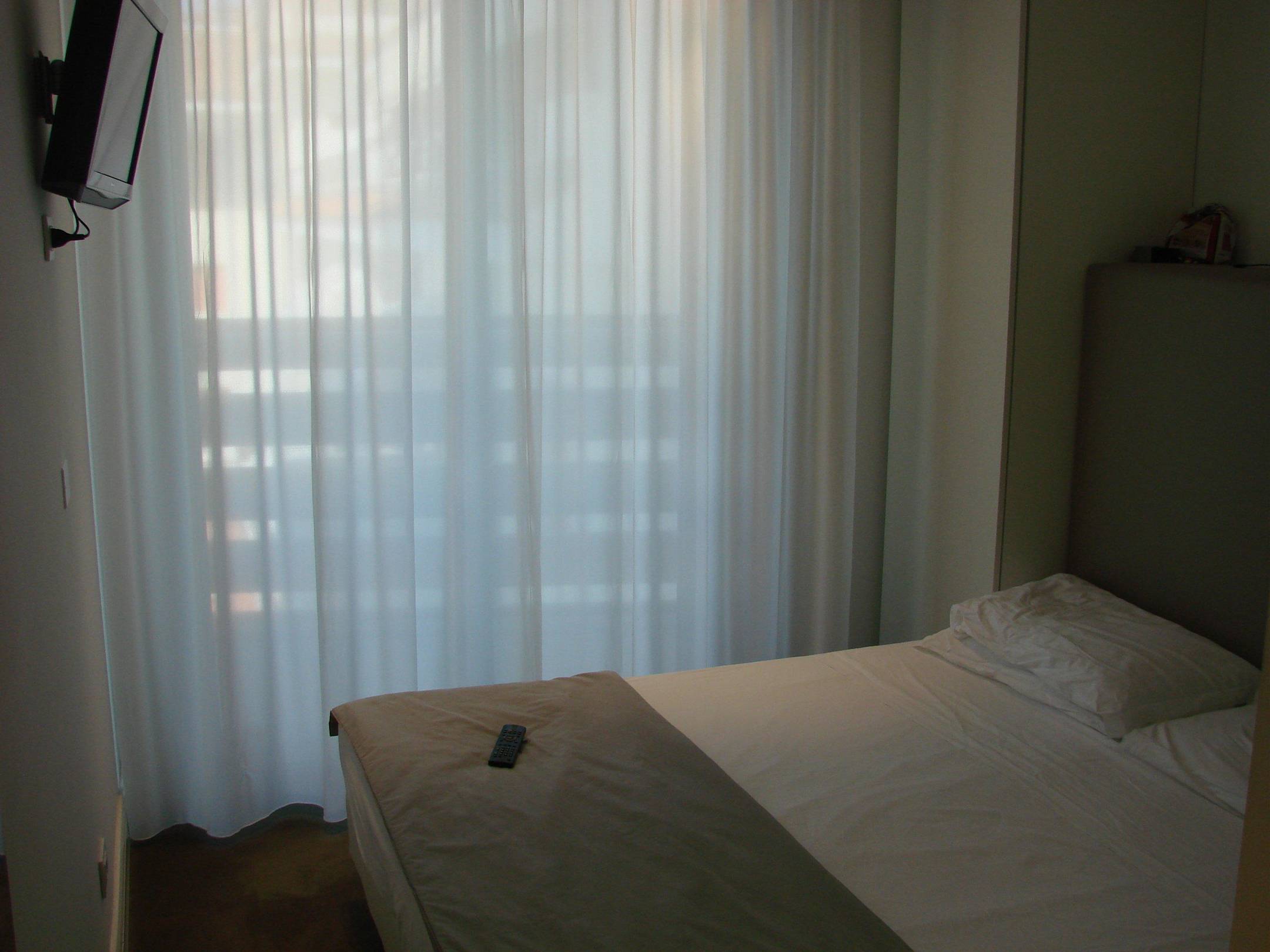 Platz für ein Doppelbett und einen FlachbildschirmLink und re. vom Bett sind zwei kleine schmale Kleiderschränke. Sonst kein Schrank vorhanden.
