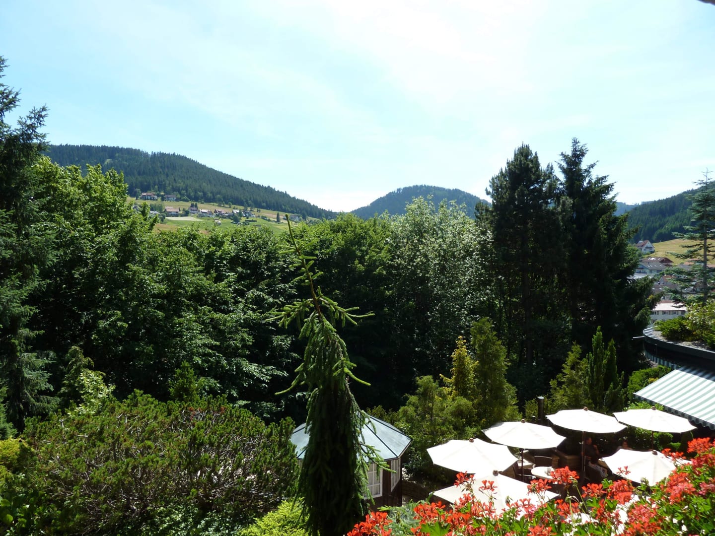 Blick aus dem Zimmer auf die Hotelterrasse