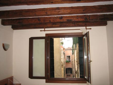 ZimmerfensterBlick zum Zimmerfenster im Hotel Bartolomeo in Venedig und auf die ruhige Gasse hinter dem Hotel, Holzbalken an der Decke sehr hübsc