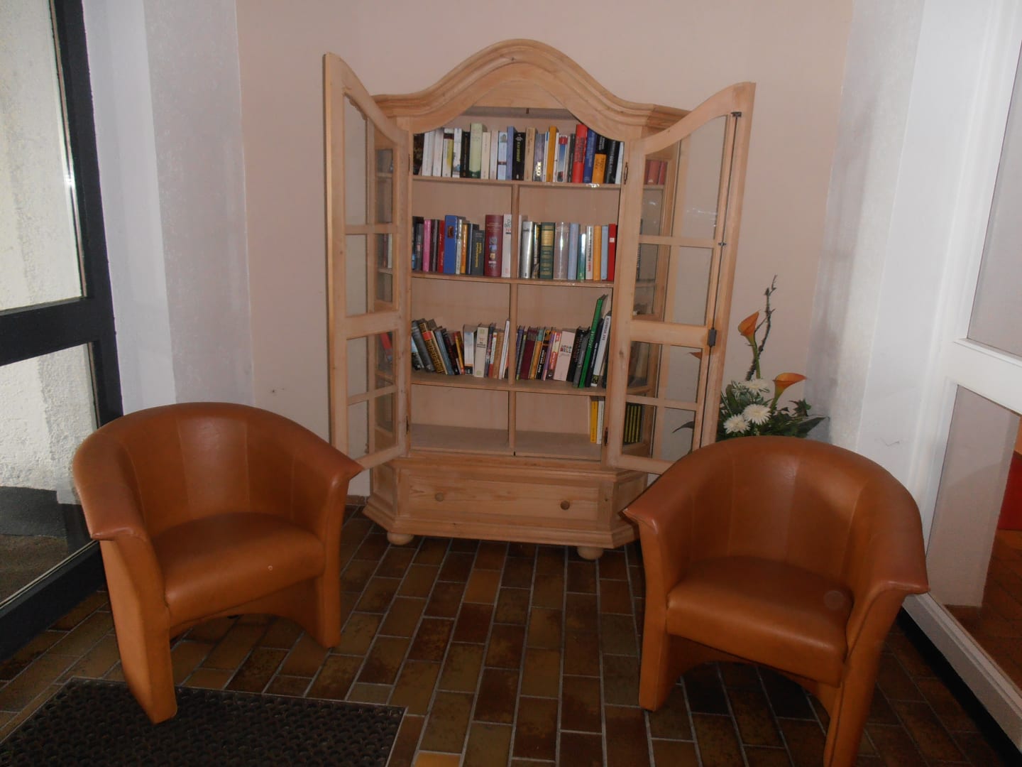 Leseecke, Schrank mit Büchern zum Ausleihen, unten im Eingangsbereich