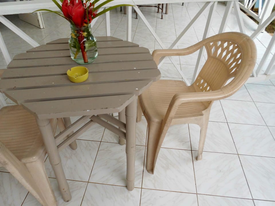 Terrasse mit kaputten Stühlen und dreckigem Tisch