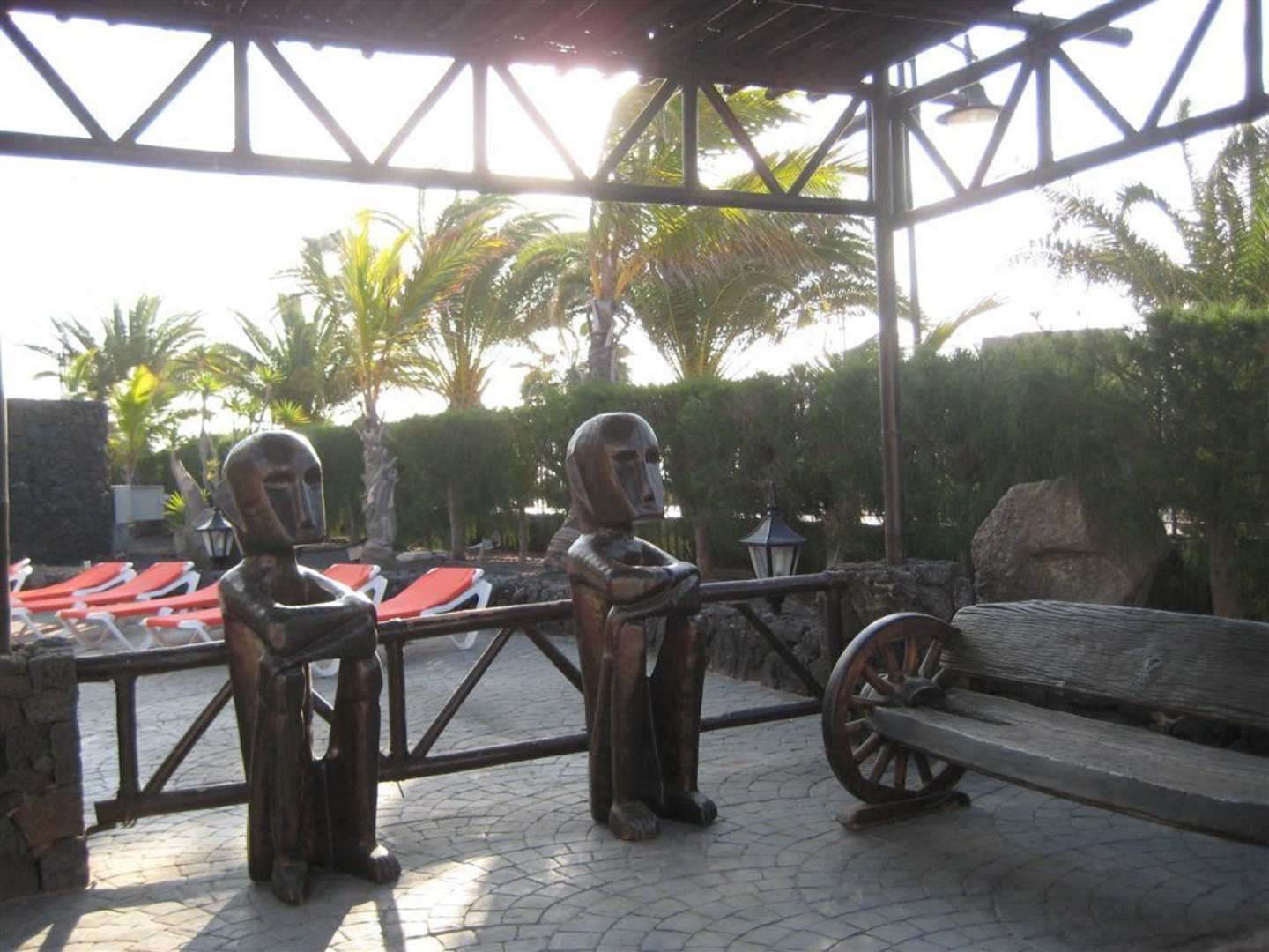 Das gibt es auch am Pool Nette Holzfiguren und eine Holzbank