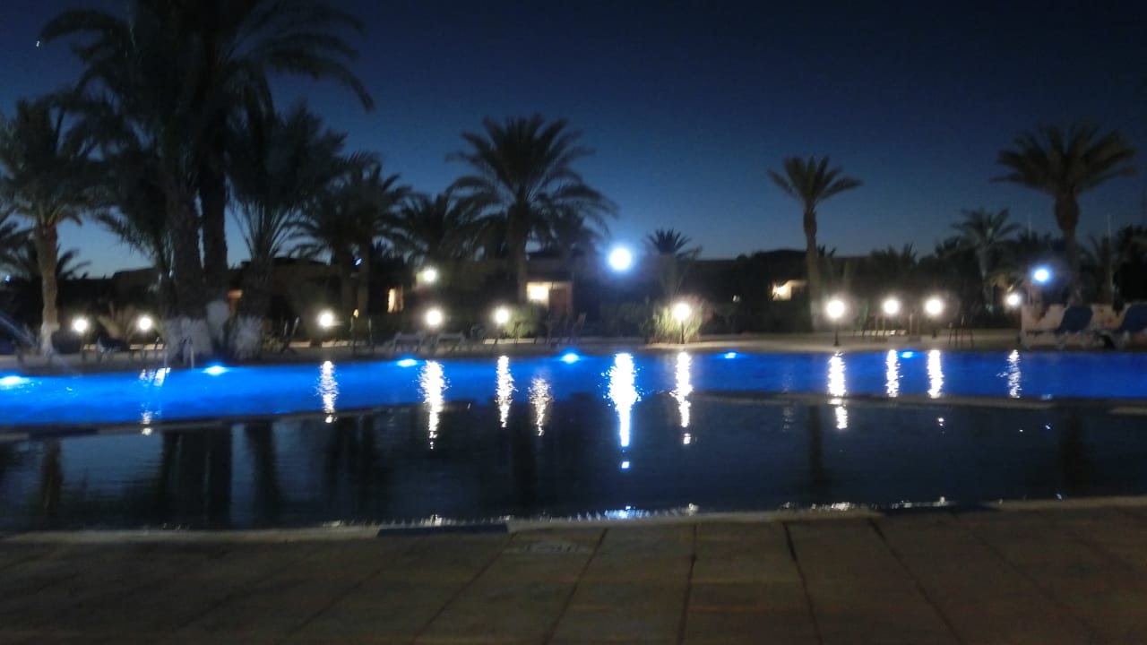 Poolanlage am Abend mit Sitz- und Liegemöglichkeiten