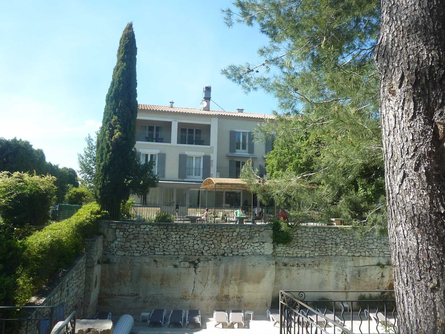 Aus dem Garten auf Hotel mit überdachter Terasse