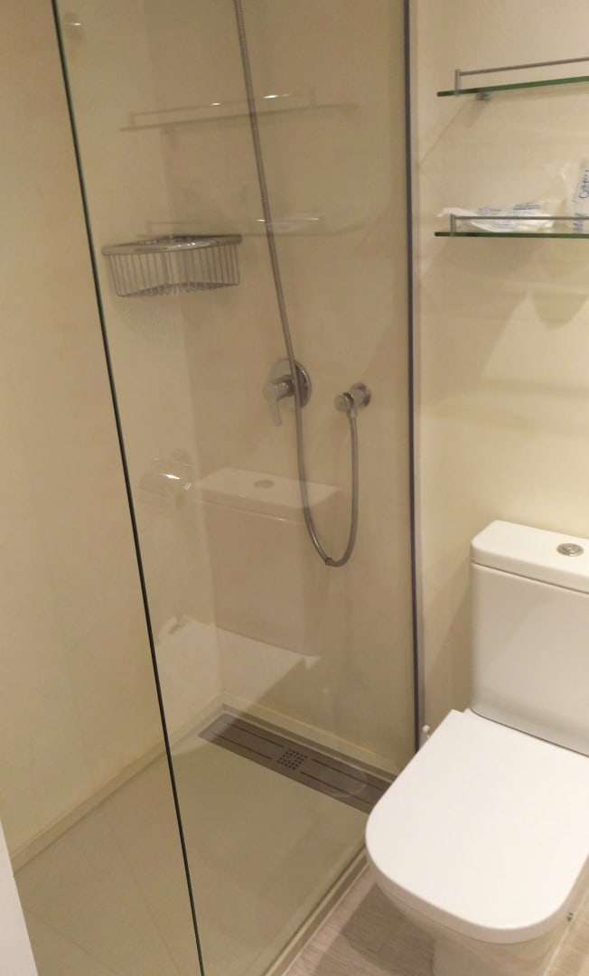 Begehbare Dusche im modernen Zimmer.