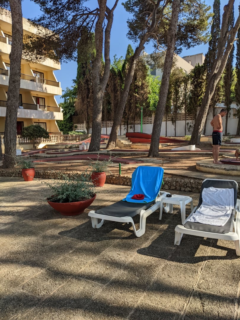 Liegen unter den Pinienbäumen mit Minigolfanlage im Hintergrund.