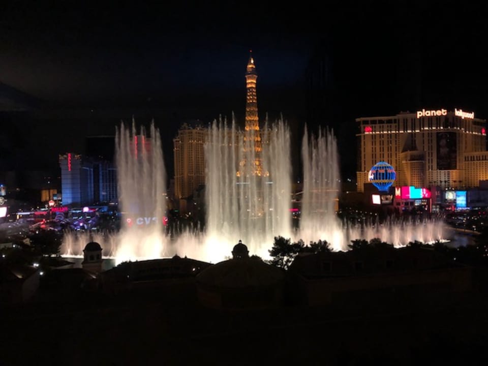 Ausblick aus Doppelzimmer Fountain View 11.Stock bei Nacht. Die Wasserspiele gehen bis Mitternacht.