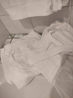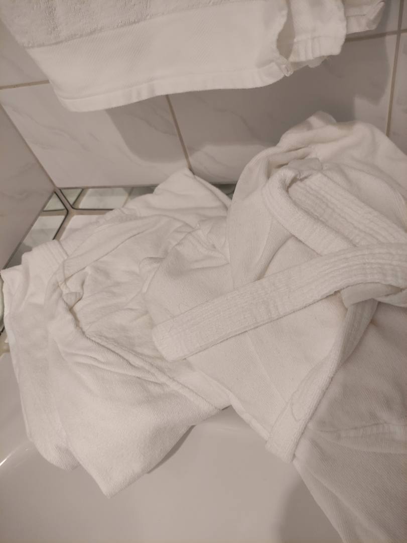 Bademäntel von unseren Vorgängern. Auf unserem Bett befanden sich unsere, zusammengefalteten. Aber leider war da ein Kinderbademantel für meinen Mann dabei. Nicht sehr professionell.