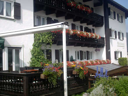 Die Frühstücksterrasse mit Blick auf die Balkonzimmer