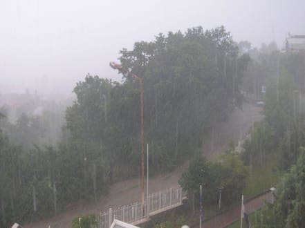 Blick vom Balkon bei starkem Regen auf die Straße