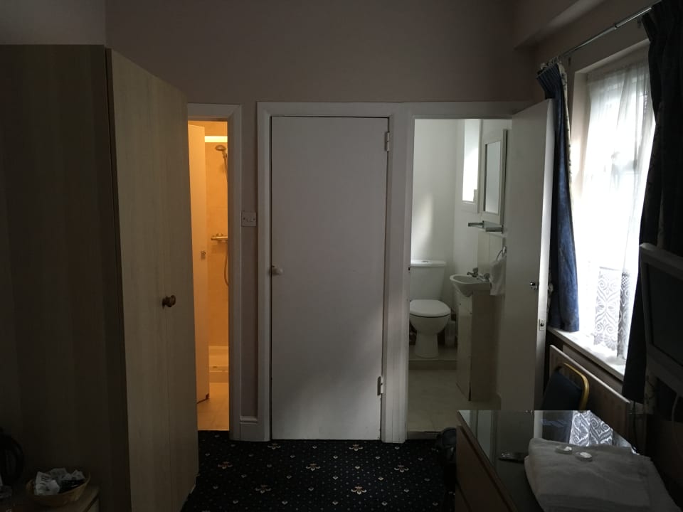 ZimmerIn der Mitte der schmale Zimmerzugang, rechts Toilette mit Miniwaschbecken, links Dusche. Davor Kleiderschrank