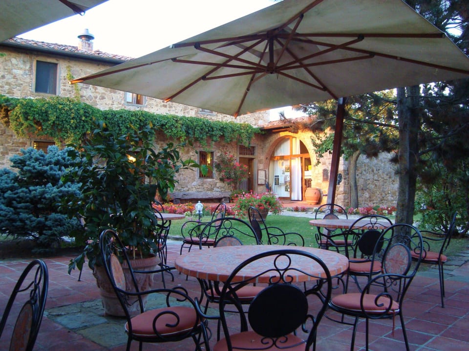Blick von der Frühstücksterrasse auf die Rezeption