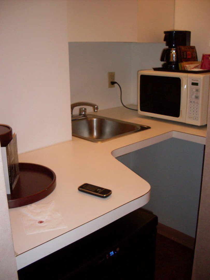 Eine kleine Küche mit Mikrowelle, Kaffeemaschine und Spüle