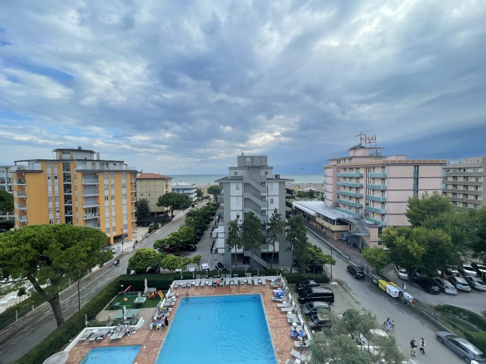 Blick vom 5. Stock über die Pool's zum Strand