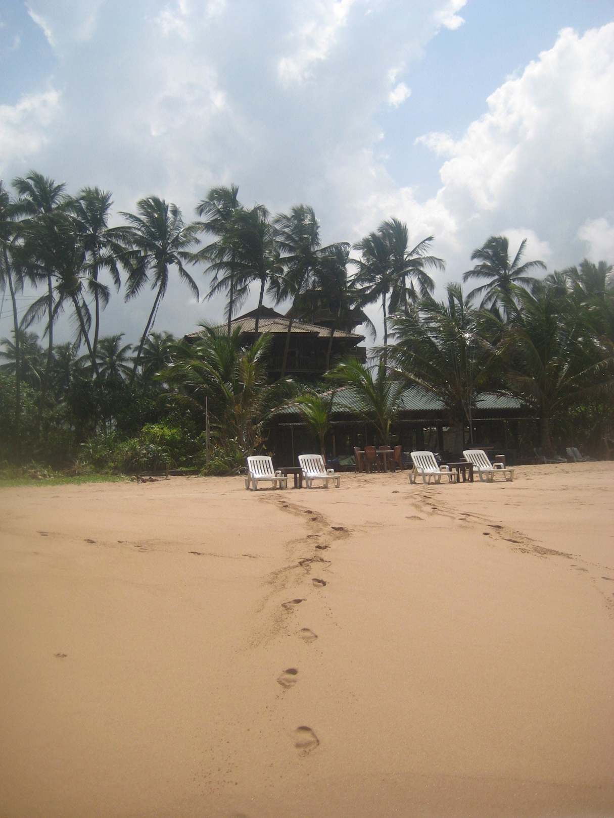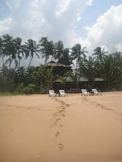 Strand mit Beachbar, im Hintergrund Warahena Hotel