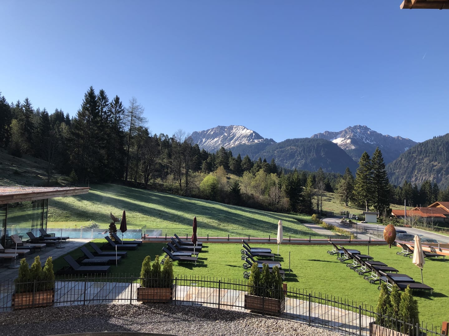 Blick vom Zimmerbalkon auf den Außenpool, Liegewiese und die Berge