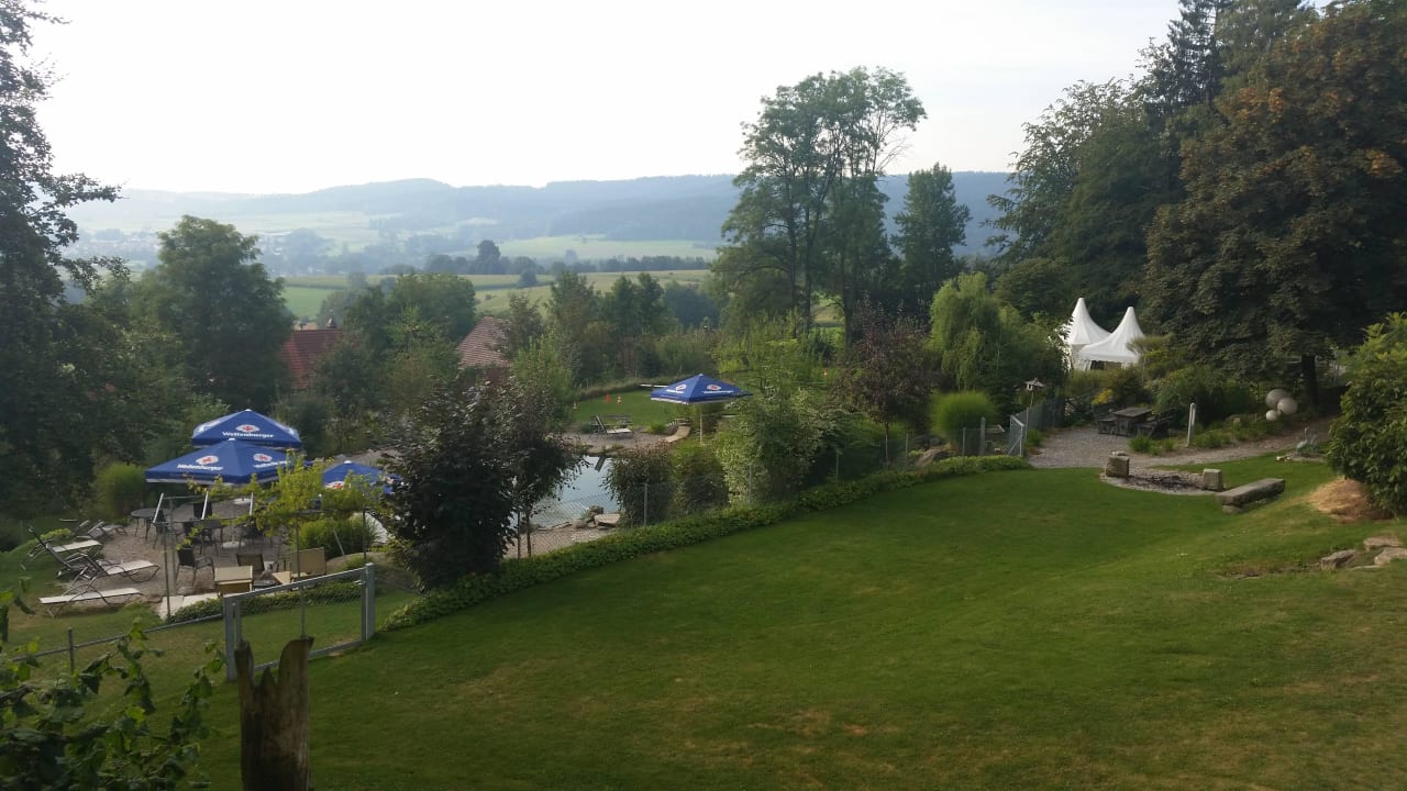 Ausblick vom ZimmerAusblick vom Zimmer mit Balkon, Hundeteich und unterer Hundeplatz mit diversen Agility Sportgeräten