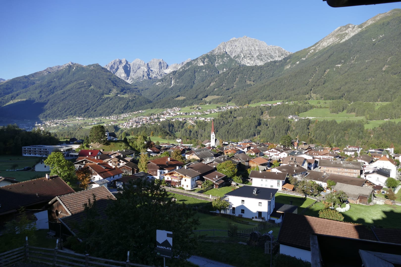 Sonnenaufgang , Blick vom Balkon auf Mieders und die Berge