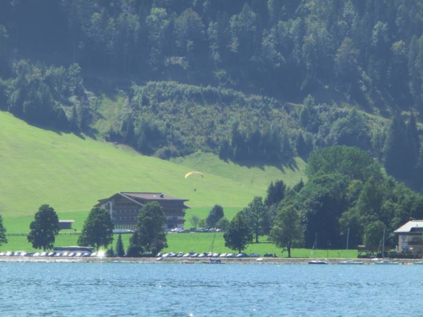 Vom See ausDa waren wir mit einen Elektoboot auf dem Achensee unterwegs. Das ist das Hotel vom See aus.
