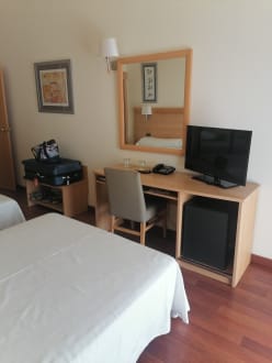 ZimmerTV. Deutsche Sender: RTL, ARD, ZDF, WDR, Eurosport. 1 kleiner runder Tisch mit 2 Stühlen. Minibar