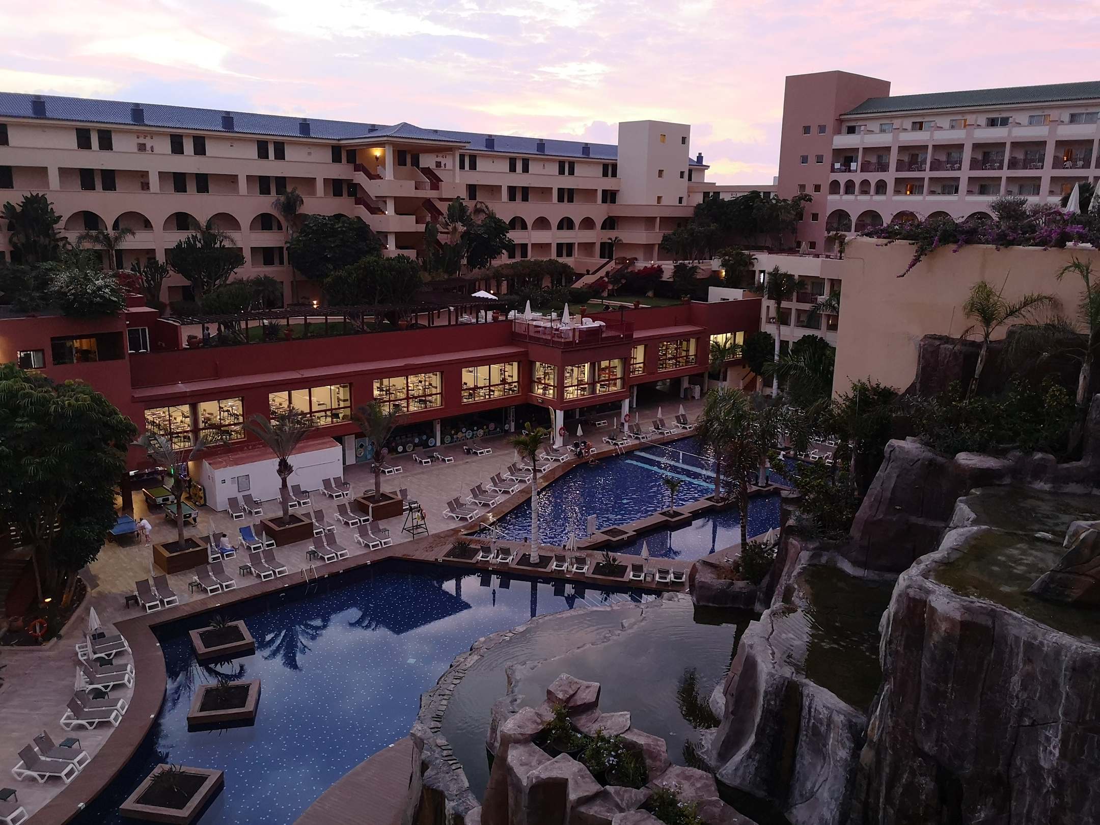 Untere Poollandschaft, fotografiert vom 5 Stock, Dachterrasse mit weiteren Pools.