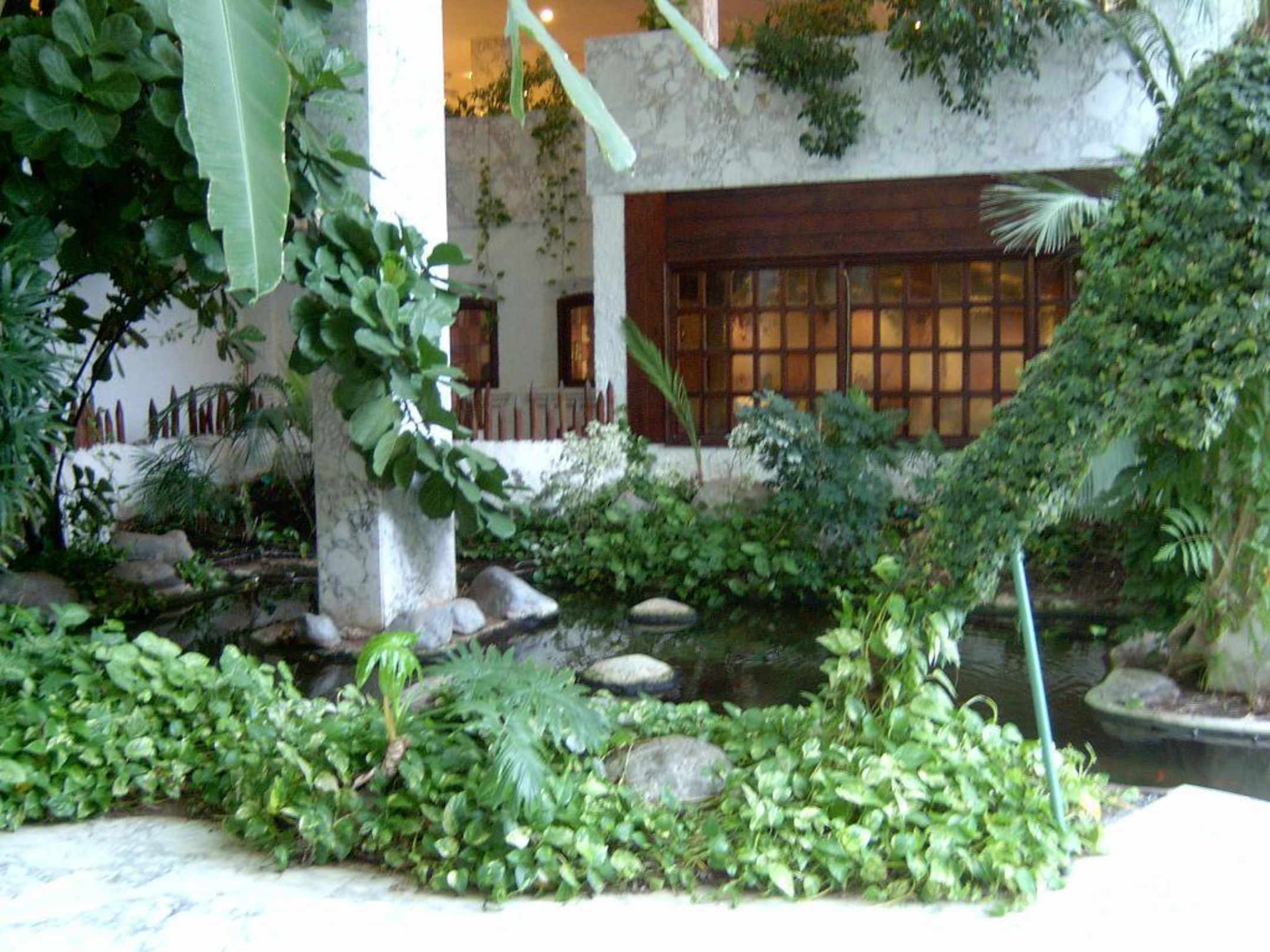 Beim Gang ins Restaurant und zum Pool durchquert man eine schöne Grünanlage mit Wasser.