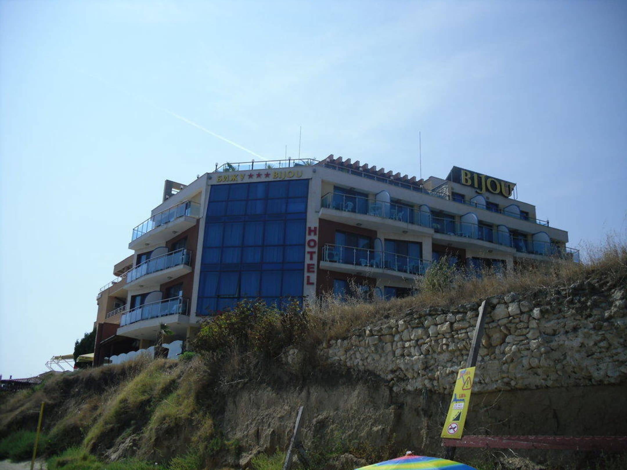Eingang vom Strand ausDer Strand befindet sich ca 10 m entfernt und auch 3 m tiefer. Ist aber über ausgebaute Stufen gut zu erreichen.