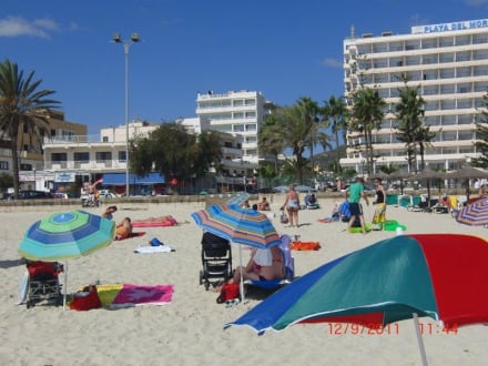Hotel Biniamar (in der Mitte) vom Strand aus fotografiert.
