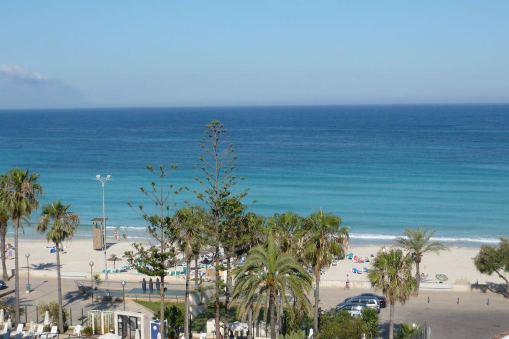 Blick vom Zimmer auf den Strand und die Promenade.