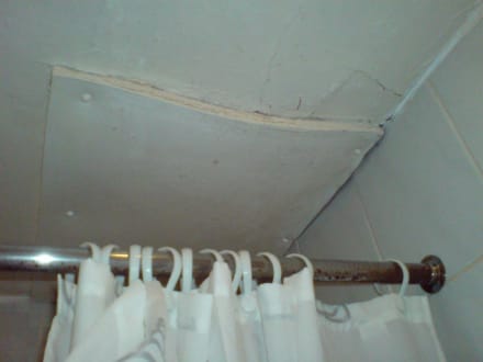 Kein Spass im BadRostige Duschstange, gewölbte und mit Spanplatten geflickte Decke, zum Abtrocknen zu klein