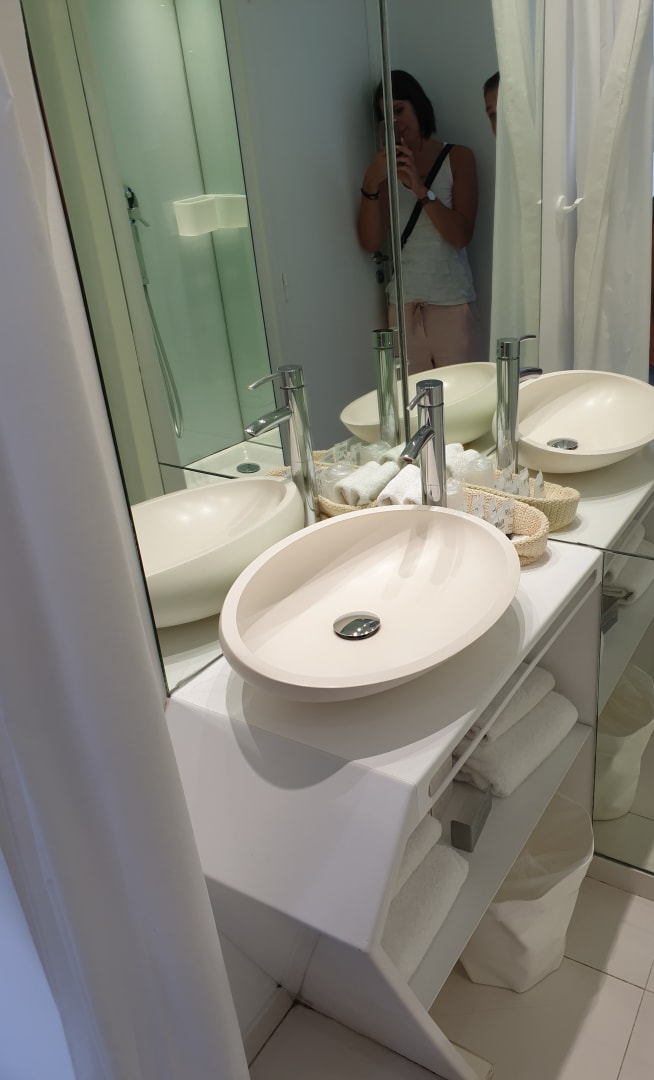 Badezimmer durch Vorhang vom Zimmer getrennt