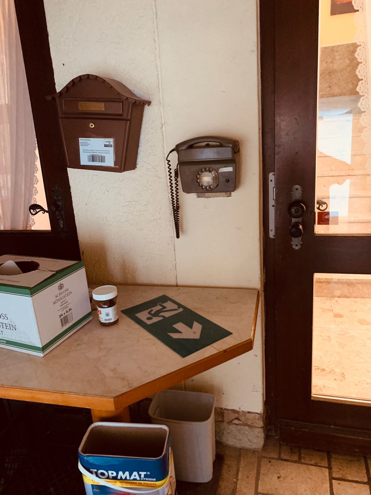 Innen fehlende Notausgangsbeschilderung liegt außerhalb. (Notruf-)Telefon außer Funktion.