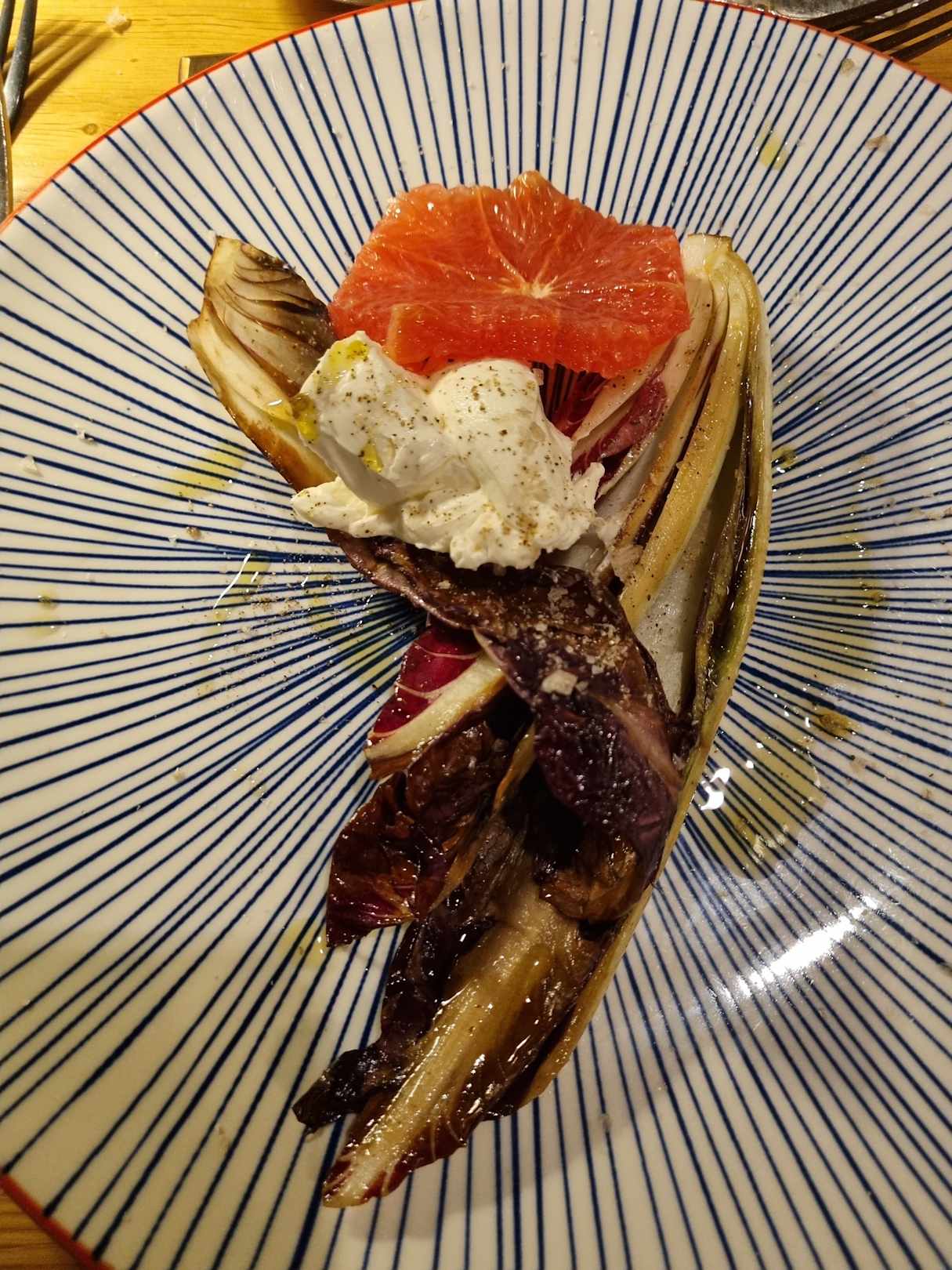 GastroGegrillter, ungewürzter Radicchio mit einem Löffel creme fraiche und einer Scheibe Grapefruit