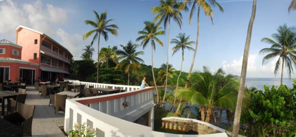 View of hotel, terrace and sea