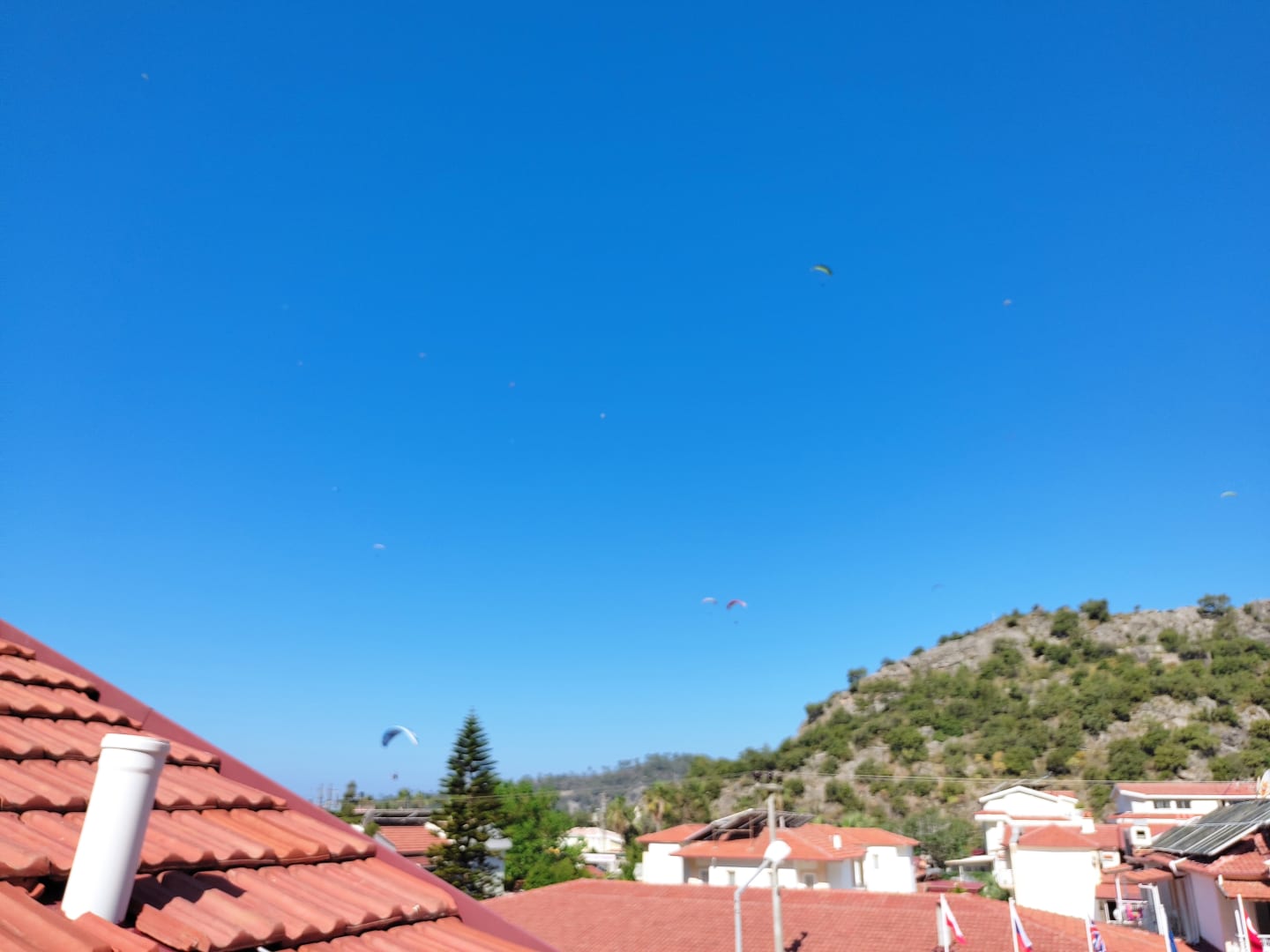 Die für Ölüdeniz obligatorischen Paraglider sind vom Balkon gut sichtbar