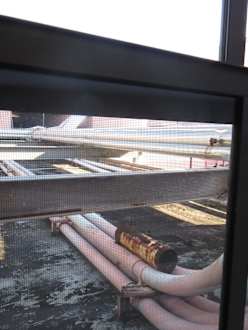 Unser Zimmer verfügte über zwei Fenster, die sich nicht öffnen ließen. Vor beiden Fenstern lag in unmittelbarer Nähe die Haustechnik auf einem Flachdach. Die dunkleren Balken im Vordergrund zeigen das Fenster.