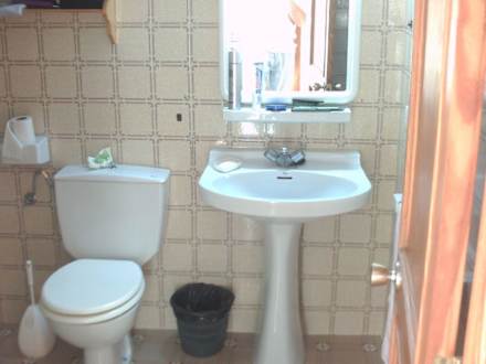 ToilettenraumSauber gekacheltes Bad, ausgestattet mit Waschbecken, Bide, Wanne und Toilette. Alles funktionierte einwandfrei, nur die Dusche nicht.
